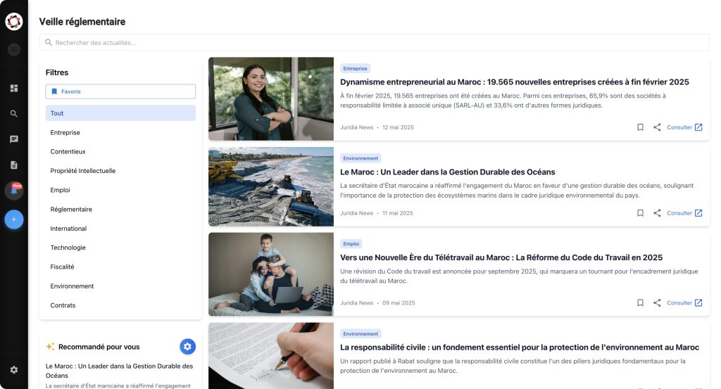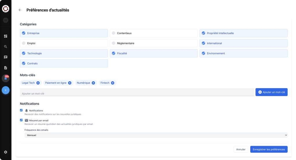Configurez vos préférences en quelques clics : sélectionnez vos thématiques juridiques, précisez vos mots-clés prioritaires, choisissez votre fréquence d’alerte. Juridia vous informe uniquement sur ce qui compte pour vous.